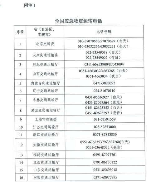 為及時受理和解決應(yīng)急物資運輸車輛通行中的相關(guān)問題,切實保障車輛的順暢高效通行,交通運輸部在《通知》中向社會公開了全國各省(區(qū)、市)交通運輸廳(局、委)應(yīng)急運輸電話。