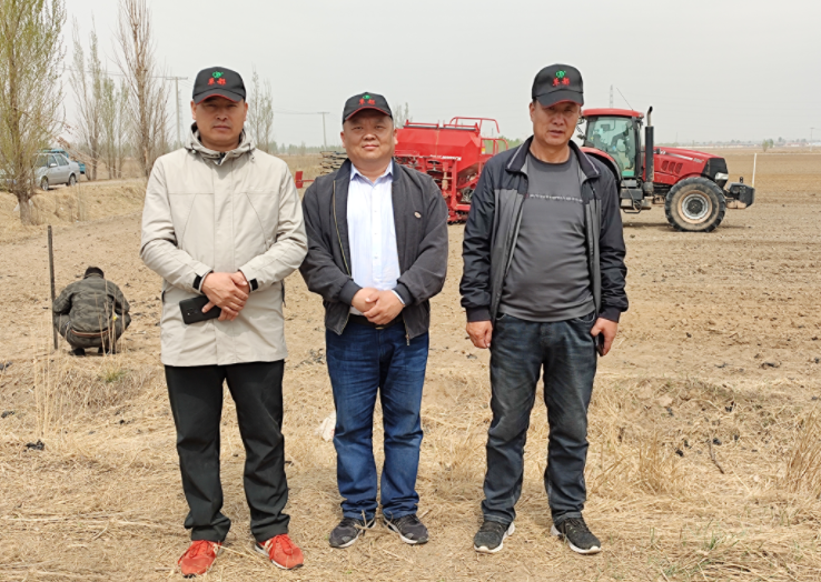 ▲草都和林園區(qū)總經(jīng)理李國成、一家村園區(qū)總經(jīng)理張春陽、韭菜溝園區(qū)副總經(jīng)理王曉東在播種現(xiàn)場安排工作
