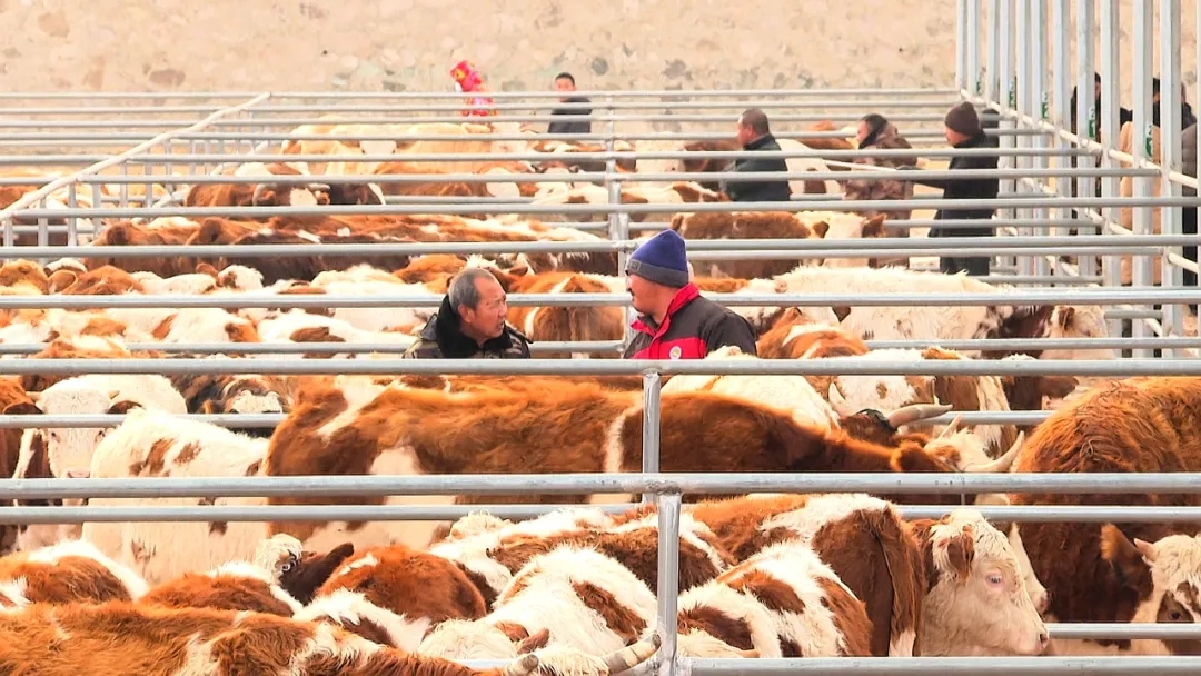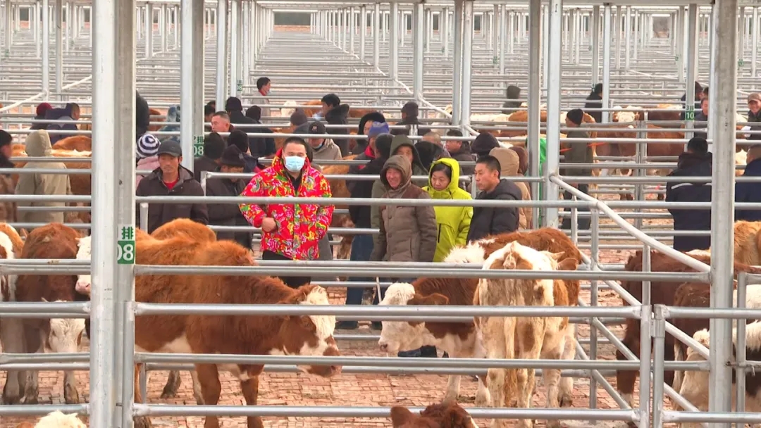 上午9點,整個交易市場熱鬧非凡,一頭頭體格健壯的肉牛在圈舍內一字排開,人們三五成群地圍聚在一起,客商們根據實際需求,從牛的品種、骨架、體形、年齡等方面分析比較價格。