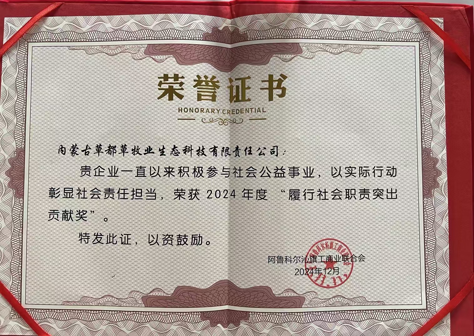 12月27日,內蒙古自治區赤峰市阿魯科爾沁旗舉辦全旗企業家年會,會上,草都阿旗園區喜獲旗工商聯頒發的 “履行社會責任突出貢獻獎”。
