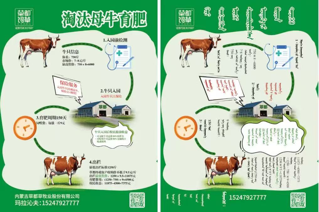 牧民淘汰母牛經過育肥,出欄時體重達到1400斤左右,銷售價格突破一萬五千元!減去飼喂成本,和傳統的淘汰母牛銷售方式相比,通過草都正藍旗桑根達來園區育肥后出欄,每頭牛能增收三千至四千元,樹立了當地牧業增效、牧民增收的新典范。