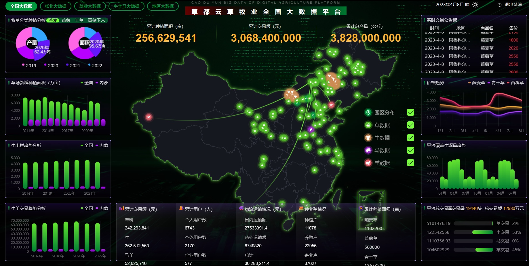 ——數智搭臺,構建一網一圖一朵云 依托“互聯網+物聯網 +云計算”技術打造草都云平臺,主導建設內蒙古草牧業大數據 平臺,為縣域草地畜牧業采集草、牧、畜等形成數據一張網、監管一張圖,動態化展示、常態化監測、可視化追溯,為草牧業發展提供科學指導依據。平臺現已在 4 個省市 6 個縣域上線運營,年交易牧草已超 30 萬噸,榮獲各類專利、軟著 40 余項。實現牧草和肉牛“線下分級收儲、線上交易結算”。